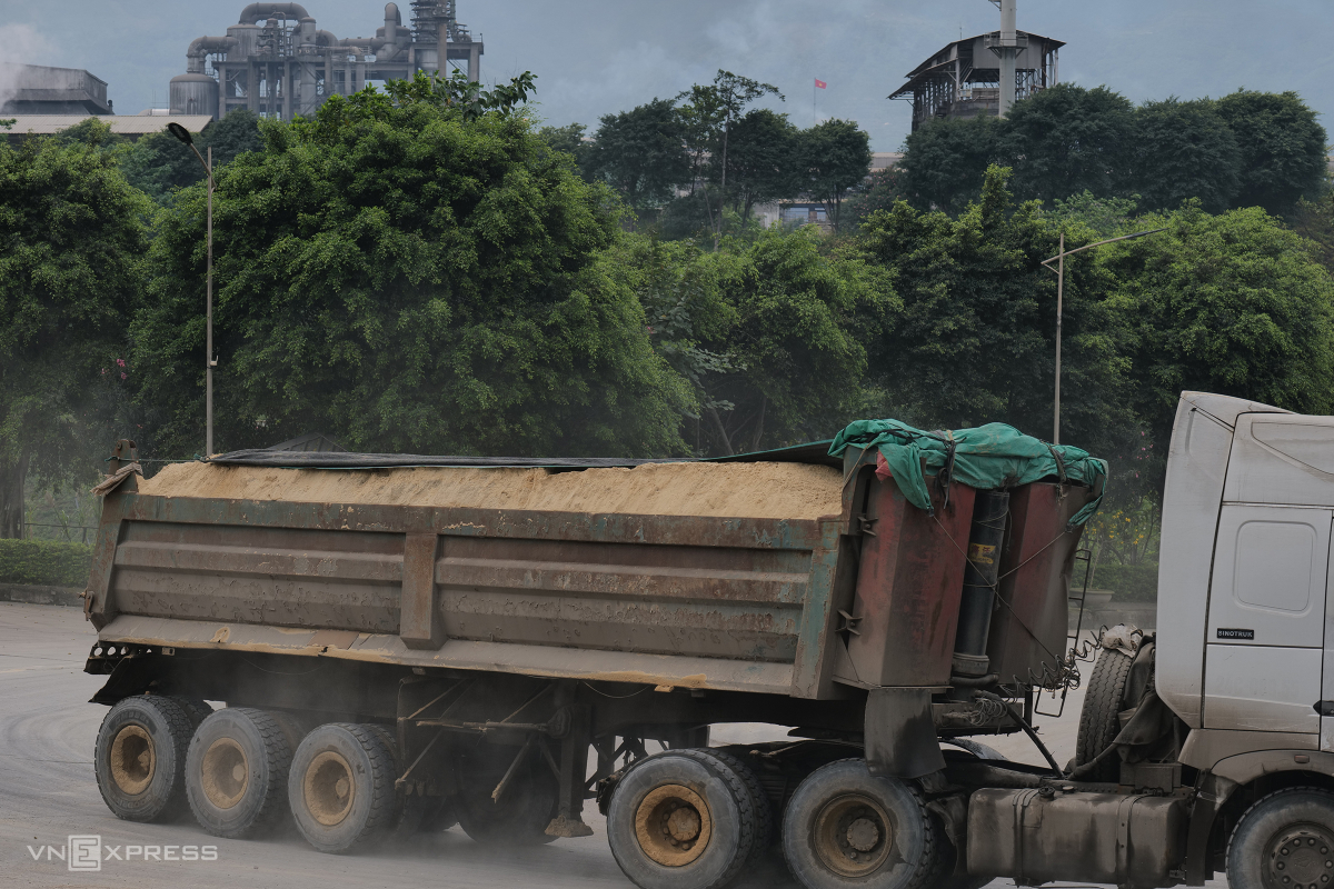 Hàng ngày, xe ben chở vật liệu nối đuôi nhau ra vào nhà máy, chạy rầm rập trong khu công nghiệp và trên đường liên xã, gây ồn, bụi.