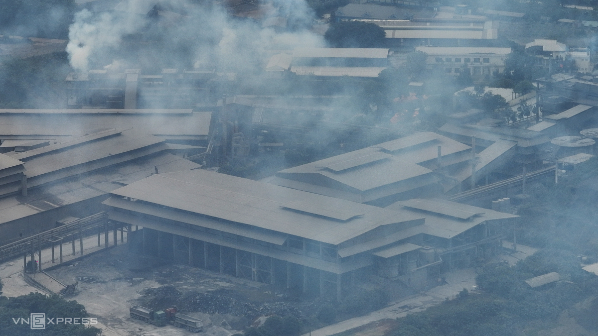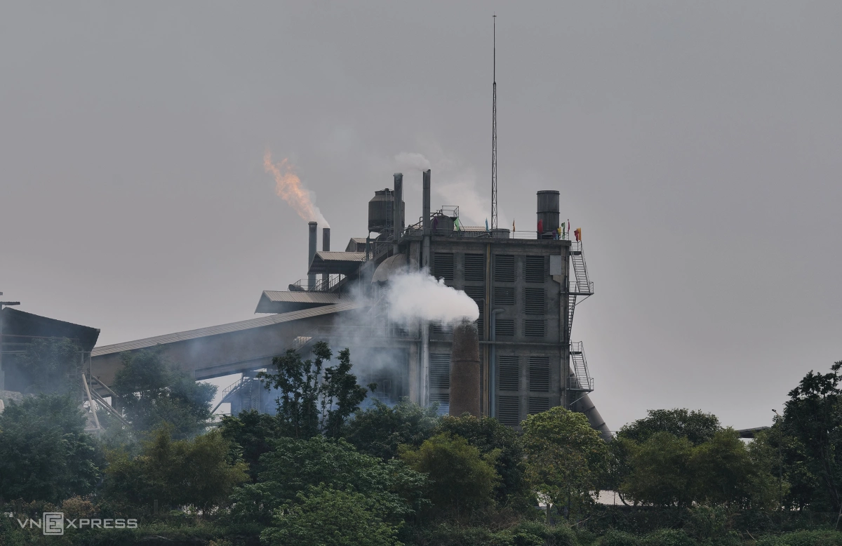 Trưa 24/3, khói từ nhà máy ra tạo thành lớp mù đặc quánh. Nhìn từ xa, bầu trời đùng đục như có sương.