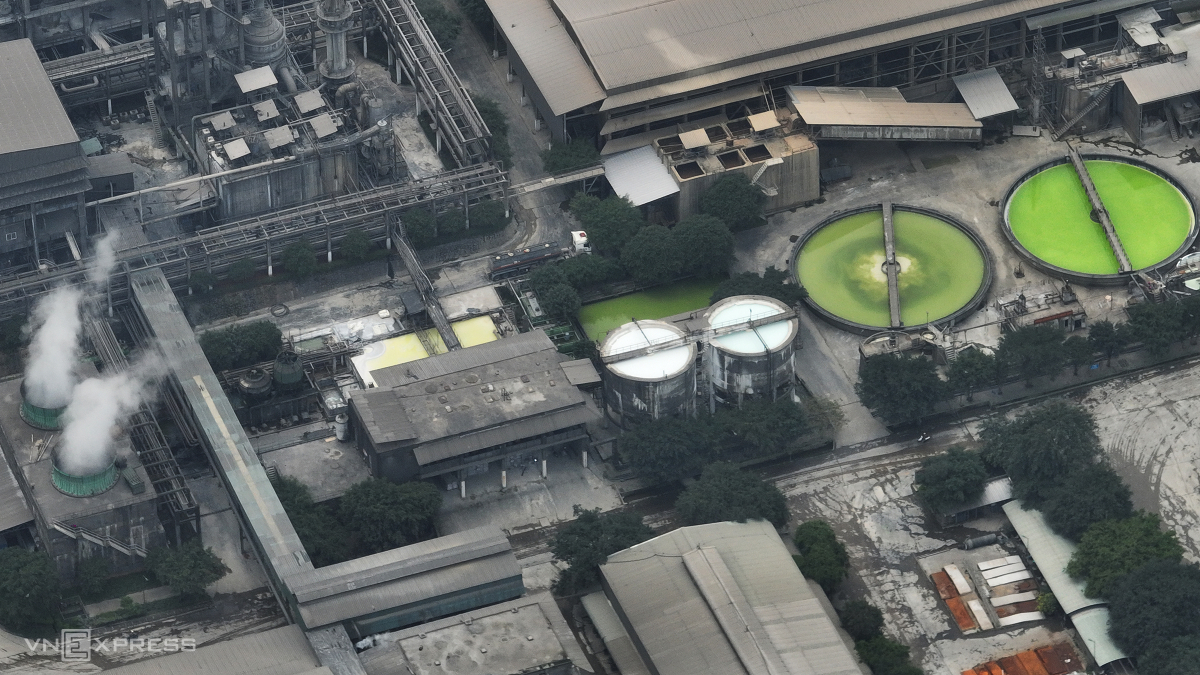 Tại nhà máy sản xuất hóa chất, các cột khói trắng, đen, vàng cao hàng chục mét. Đứng cách xa hơn một km vẫn cảm nhận rõ bụi bay vào mặt, mùi khét, hôi đậm đặc.