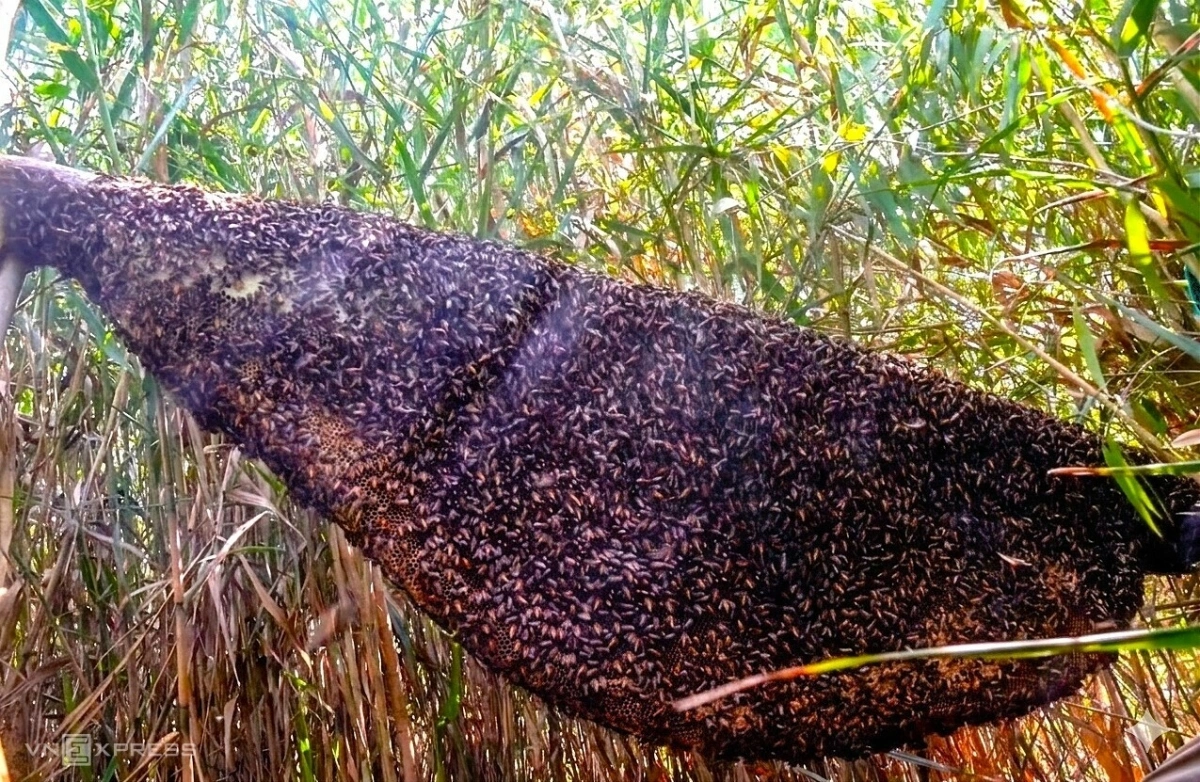 Sau khi ong bay đi, người thợ dùng dao cắt phần bánh mật. Toàn bộ thao tác chỉ diễn ra 2-3 phút và có 2-3 người phối hợp để tránh ong quay lại.