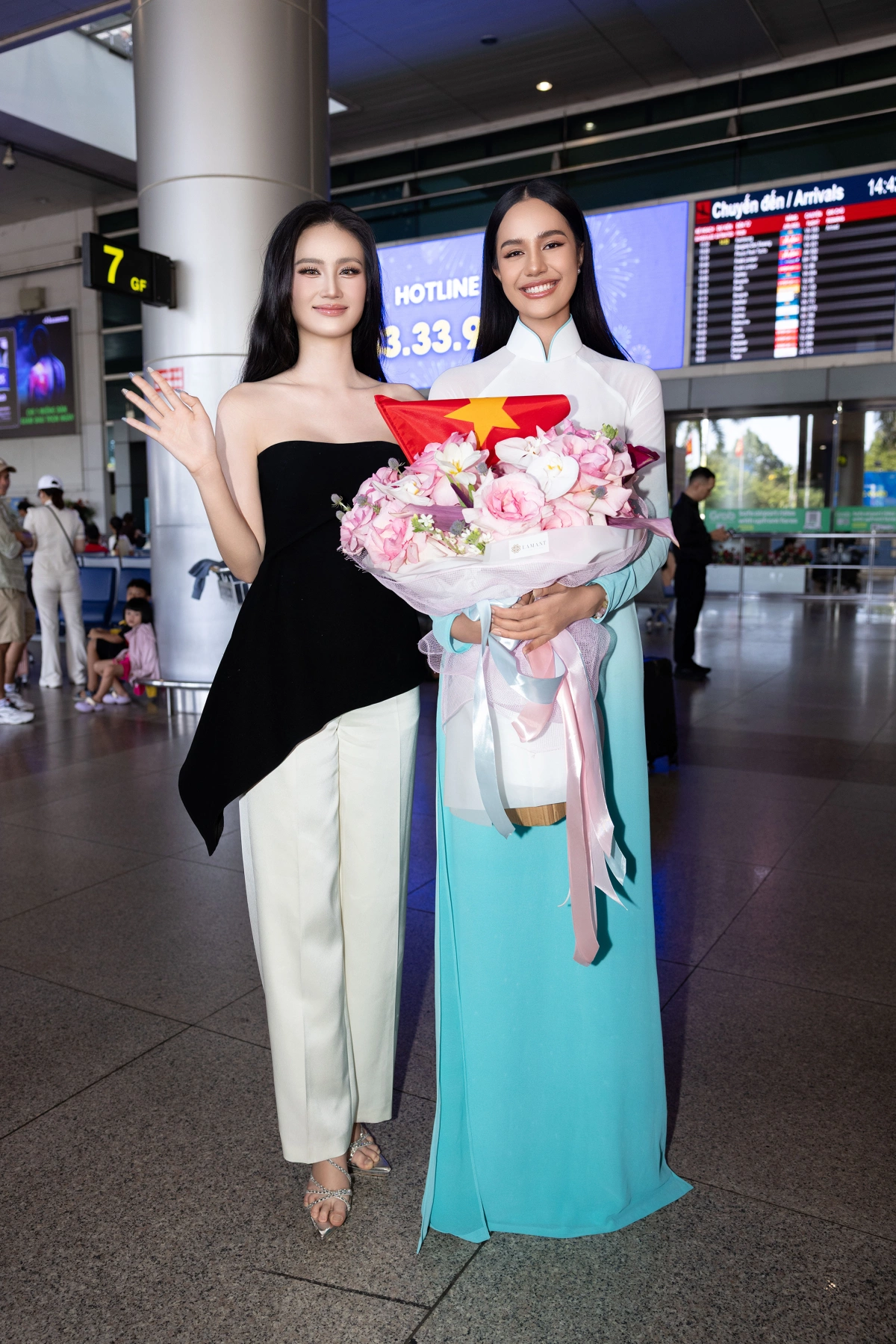 Trước đó, Hoa hậu Ý Nhi ra tận sân bay Tân Sơn Nhất để đón Opal Suchata. Mỹ nhân người Thái Lan diện áo dài, vẫy tay chào người hâm mộ Việt.