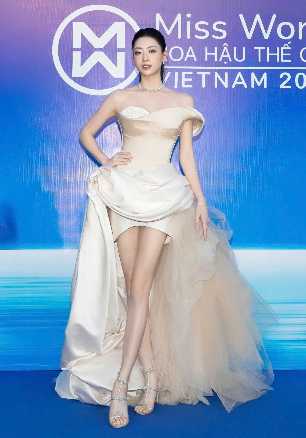 Trần Tiểu Vy chọn đầm voan xuyên thấu, phần tà đính lông vũ tạo điểm nhấn.