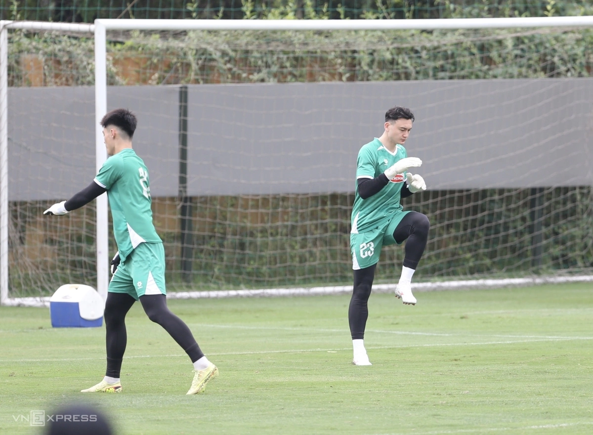 Ngoài Xuân Son phải tập riêng, quân số tập luyện của đội hôm nay là 15 người, với sự góp mặt của nhóm cầu thủ Ninh Bình gồm Phạm Gia Hưng (ảnh trái), Đặng Văn Lâm (giữa), Nguyễn Hoàng Đức, Lê Ngọc Bảo (phải) và Trương Tiến Anh, cùng Khuất Văn Khang của Thể Công.