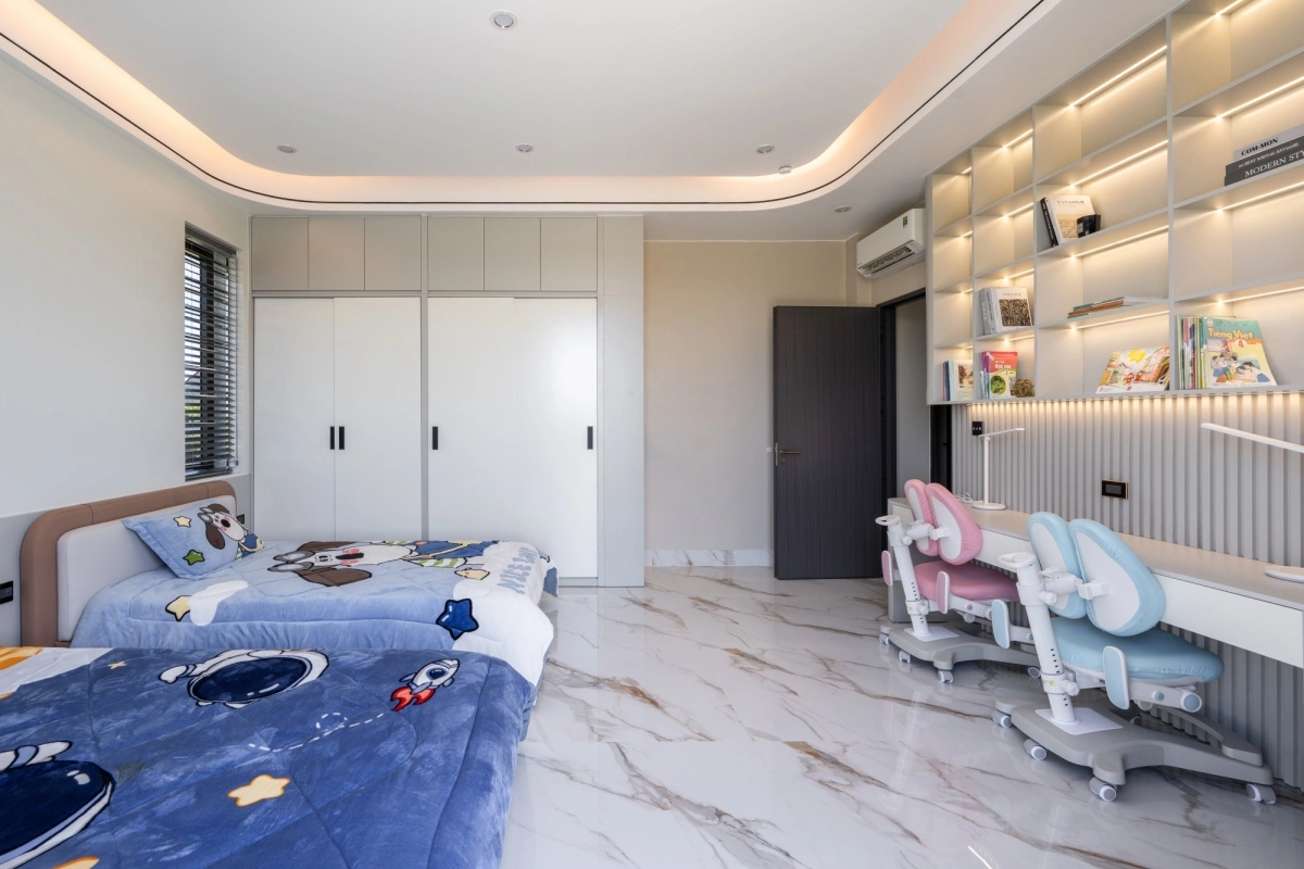 Phòng ngủ trẻ em bố trí 2 giường đơn, chăn ga họa tiết hoạt hình sinh động. Bàn học đôi đặt dọc tường, phía trên là hệ kệ sách mở nhiều ô vuông có đèn LED chiếu sáng.