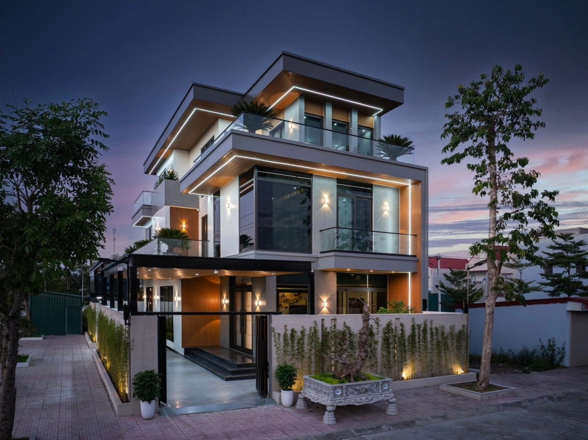 Mặt ngoài công trình xếp lớp các khối hộp lệch nhau, viền LED chạy dọc mép mái và lan can tạo đường nét sắc nét khi về đêm.