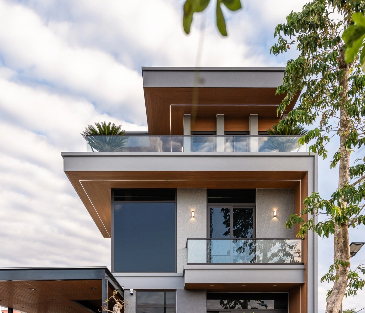 Toàn bộ công trình ưu tiên vật liệu có độ bền cao và dễ bảo trì như gạch porcelain khổ lớn (loại gạch có kết cấu đặc, chịu lực, ma sát tốt, ít bị mài mòn và tuổi thọ cao), đá ốp tự nhiên hoặc nhân tạo, gỗ tự nhiên vân óc chó. Các khu vực phòng ngủ sử dụng gỗ công nghiệp chất lượng cao đảm bảo sức khỏe và thẩm mỹ. Hệ cửa nhôm kính tăng khả năng cách âm, cách nhiệt và tối ưu tầm nhìn.