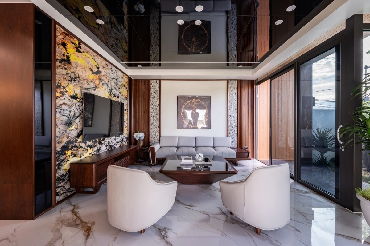 Bộ sofa lớn đặt ở trung tâm, hướng ra hệ cửa kính cao sát trần. Sàn nhà sử dụng gạch porcelain vân đá khổ lớn, bề mặt bóng nhẹ, đồng bộ với các không gian liền kề tạo tính xuyên suốt cho tầng một.