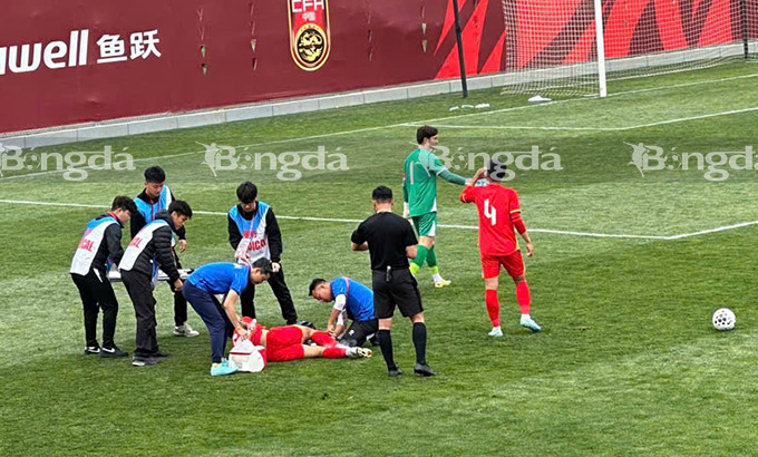 13'Thái Bá Đạt bên phía U23 Việt Nam bị đau. Cần nhờ đến sự hỗ trợ của bác sỹ. Ảnh: Trang Huế