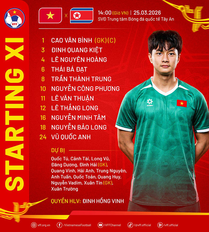 - Tại giải CFA Team China 2026, U23 Việt Nam sẽ lần lượt đối đầu với U23 Triều Tiên (ngày 25/3), U23 Thái Lan (28/3) và chủ nhà U23 Trung Quốc (31/3). HLV Đinh Hồng Vinh cho biết, với sự góp mặt của những đối thủ rất chất lượng, giải đấu này được xem là cơ hội quý giá để các cầu thủ trẻ tích lũy kinh nghiệm thi đấu quốc tế.